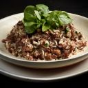 Arroz com rabada desfiada e agrião.