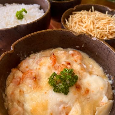 Camarões grelhados gratinados com catupiry acompanhado de arroz branco, batata palha e couve crocante